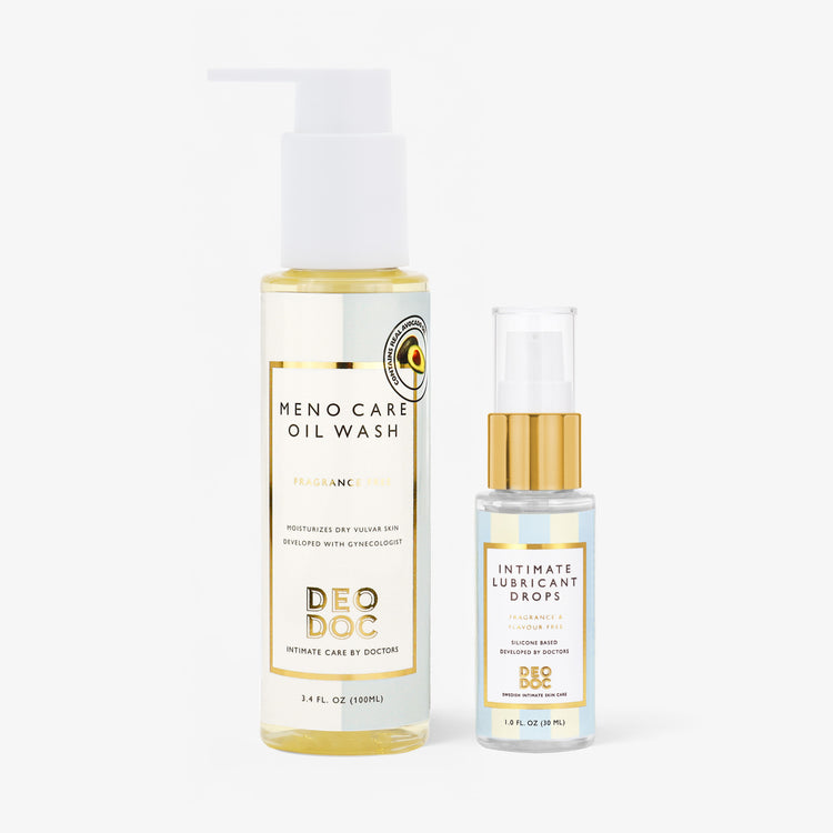 Et sett for deg som er i overgangsalderen. Hormonelle endringer i overgangsalderen kan bidra til at hudbarrieren og slimhinnene blir tørre og skjøre. Teamet vårt av kvinnelige leger og gynekologer har derfor utviklet pleiende produkter som fukter den intime huden.